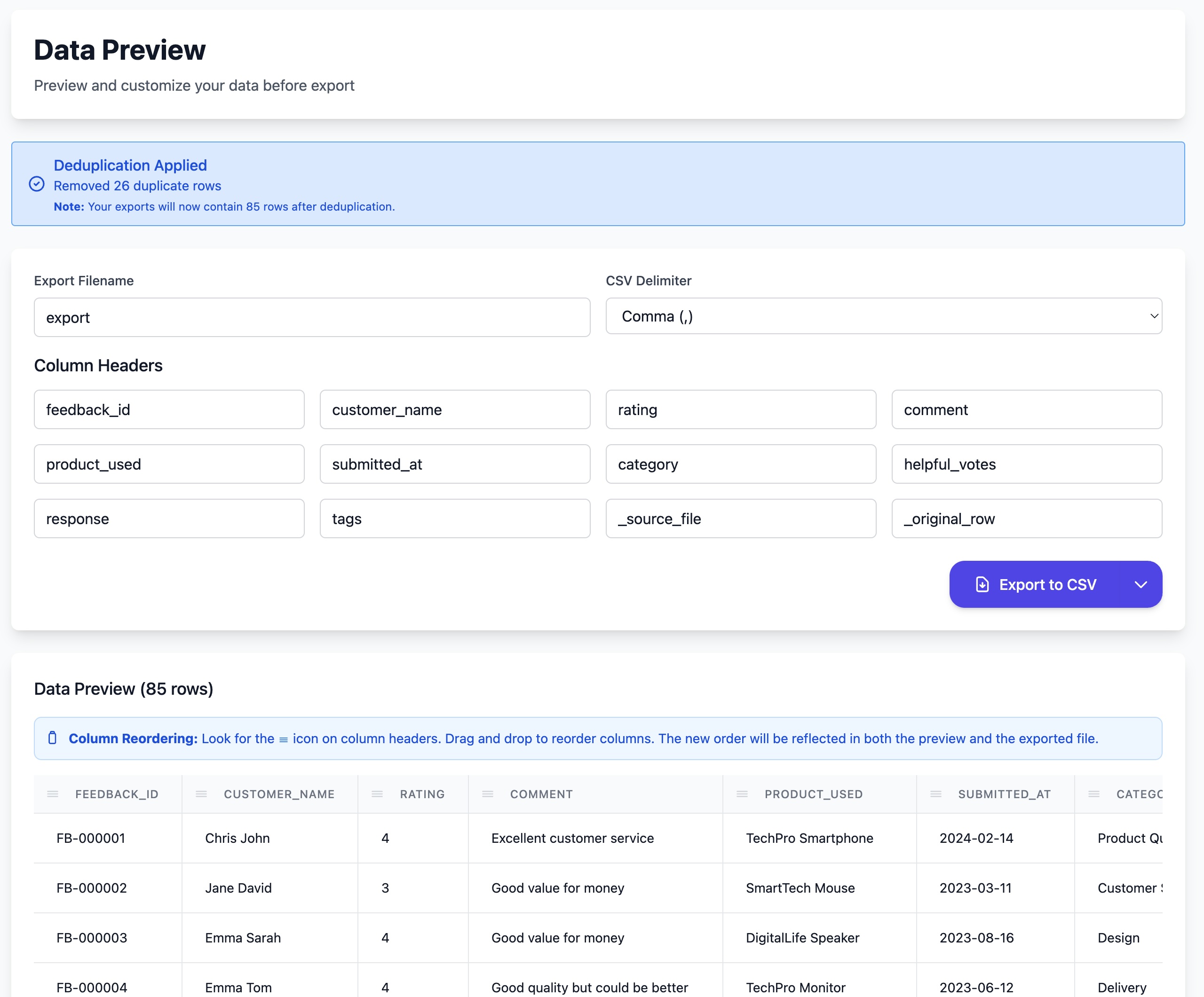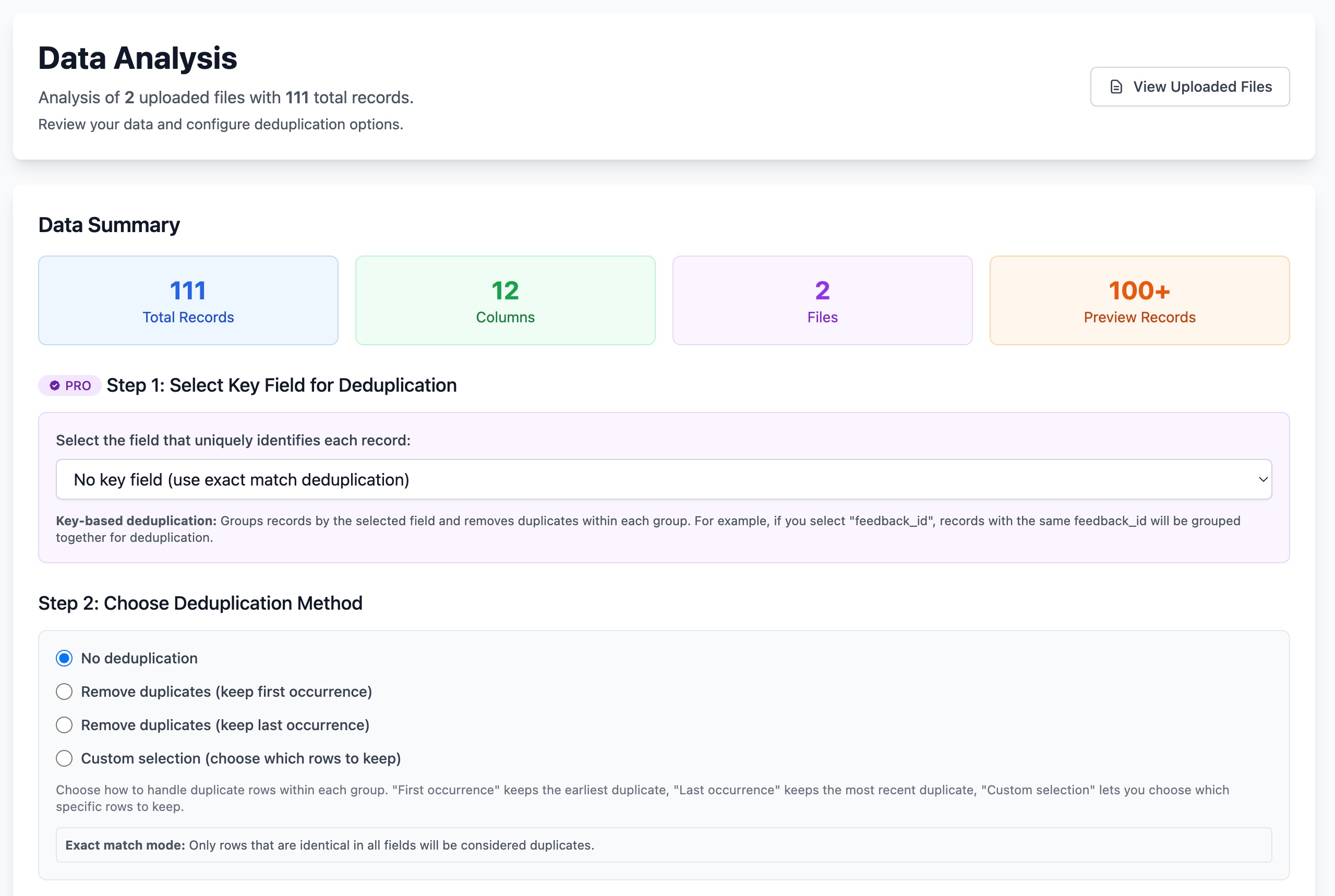 After uploading your JSON file, TableFromJSON automatically analyzes your dataset so you can clean and prepare it for export. Choose from different deduplication methods to remove duplicate rows and ensure your data is accurate and ready for reporting. This built-in JSON data analysis step helps you quickly spot inconsistencies, validate fields, and get clean, reliable tables before exporting to Excel, Markdown, or HTML.